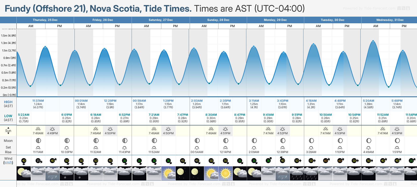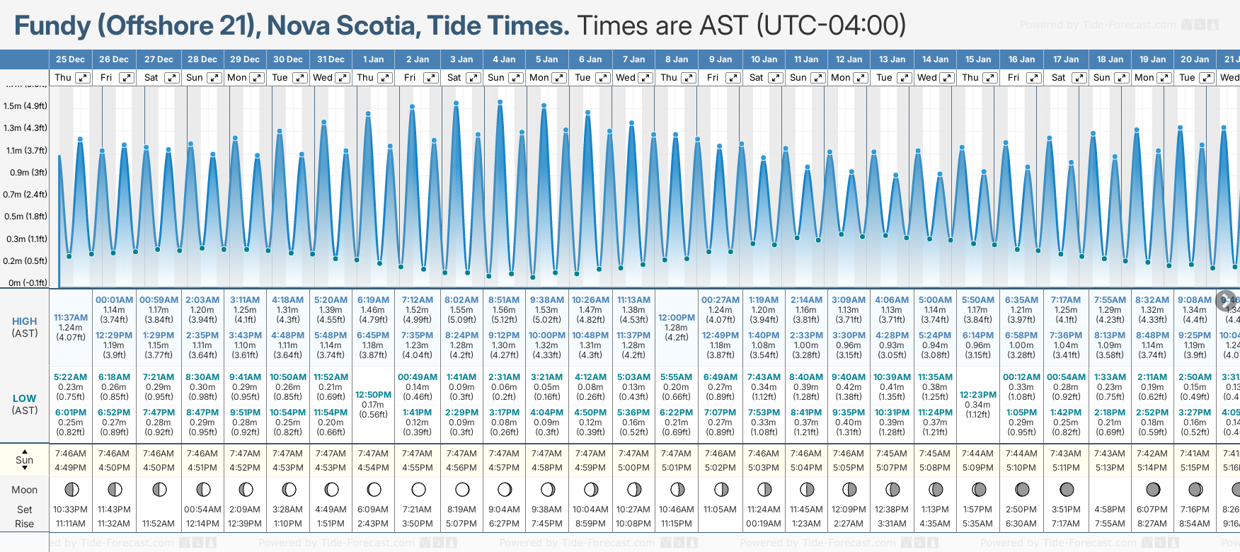 Tide chart for Fundy (Offshore 21)Showing low and high tide times for the next 30 days at Fundy (Offshore 21). Tide Times are AST (UTC -4.0hrs).