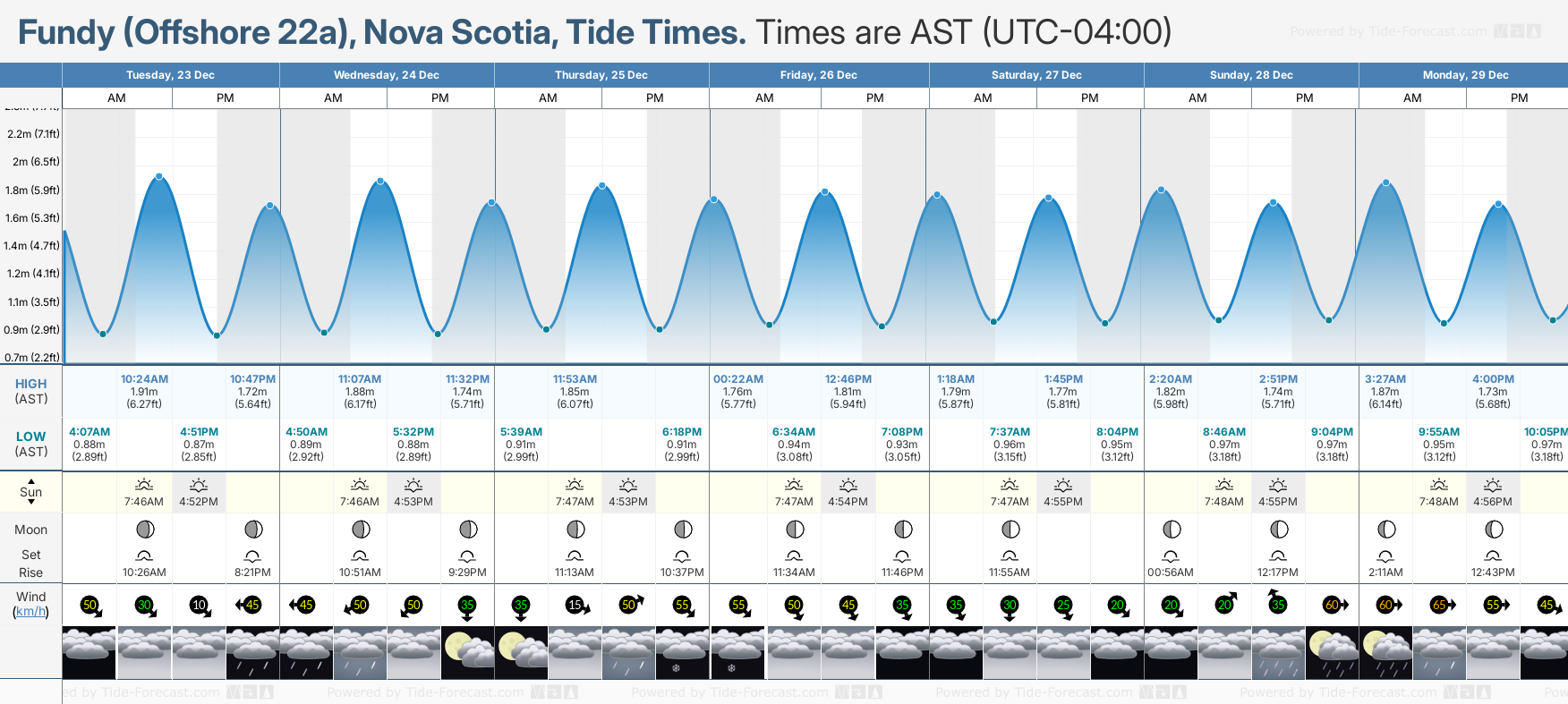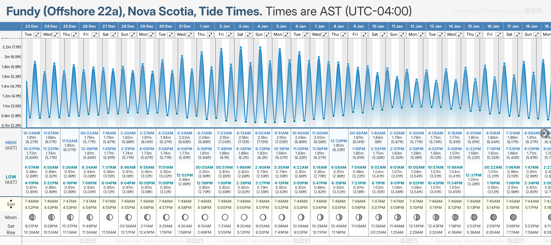 Tide Times are AST (UTC -4.0hrs). Last Spring High Tide at Fundy (Offshore 22a) was on Sun 21 Dec (height: 1.93m 6.3ft). Next high Spring Tide at Fundy (Offshore 22a) will be on Sat 03 Jan (height: 2.18m 7.2ft).