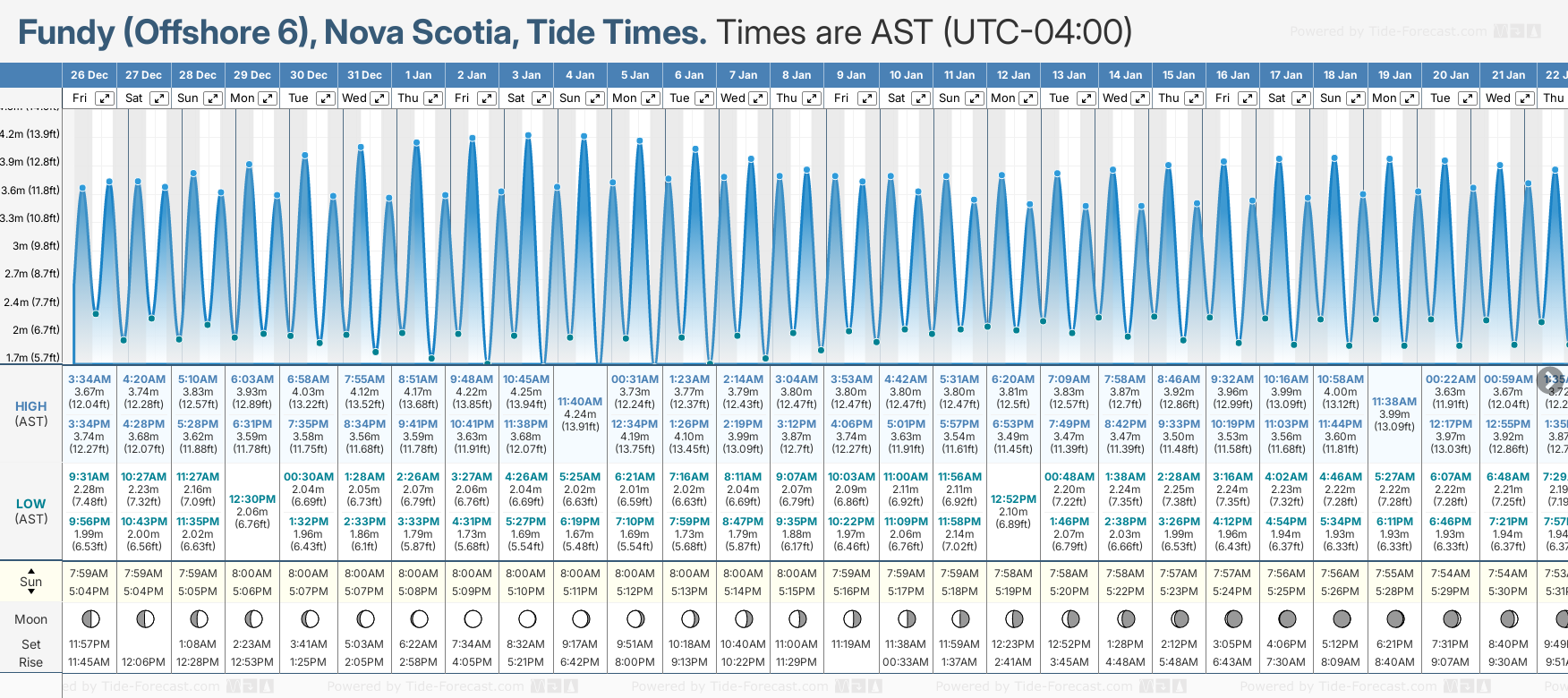 Tide Times are AST (UTC -4.0hrs). Last Spring High Tide at Fundy (Offshore 6) was on Sat 20 Dec (height: 3.98m 13.1ft). Next high Spring Tide at Fundy (Offshore 6) will be on Sat 03 Jan (height: 4.25m 13.9ft).