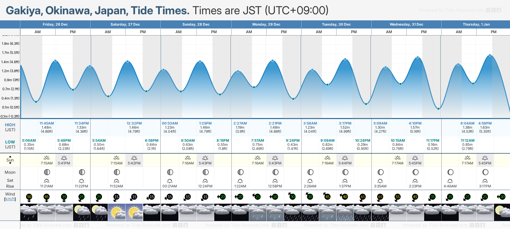Tide Times are JST (UTC +9.0hrs). Last Spring High Tide at Gakiya was on Sun 21 Dec (height: 1.78m 5.8ft). Next high Spring Tide at Gakiya will be on Mon 05 Jan (height: 1.75m 5.7ft).