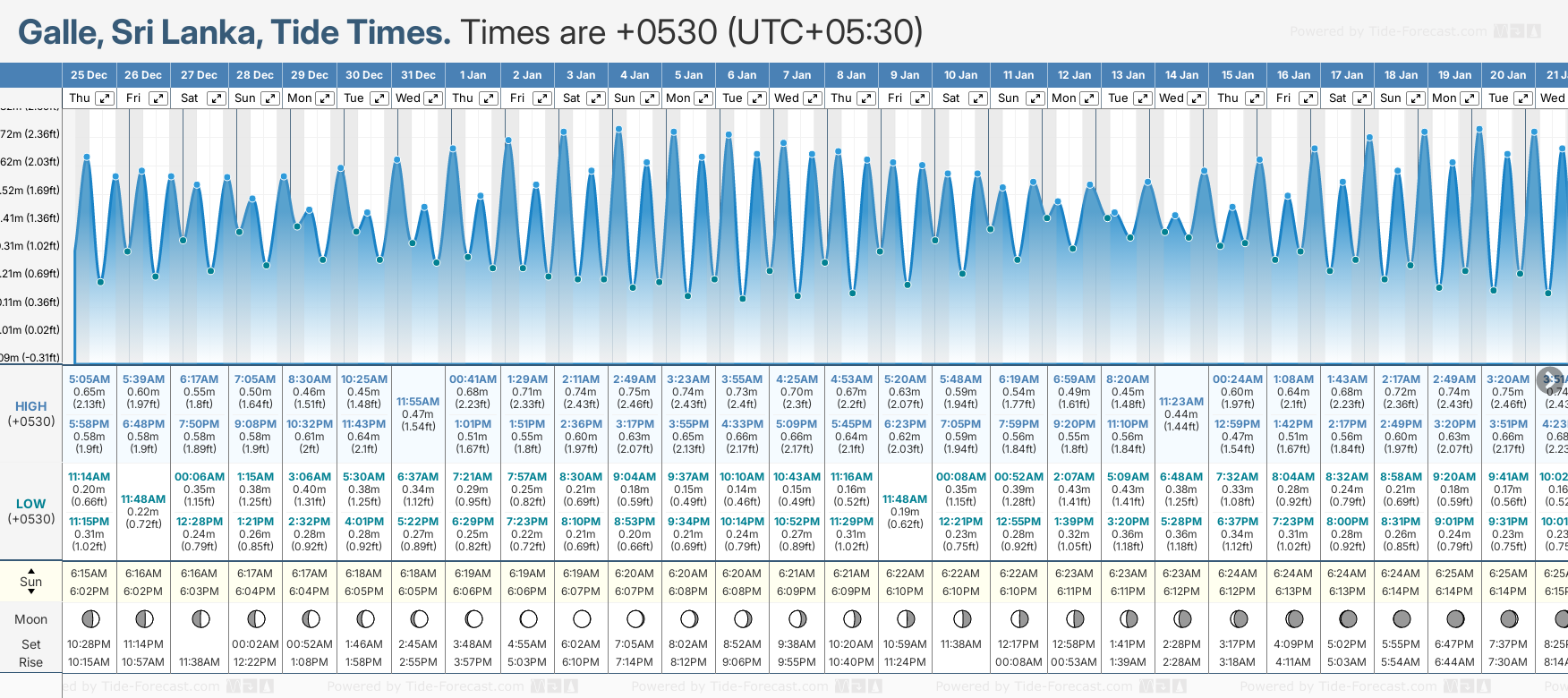 December and January Tide charts for Galle: The tide charts below show the height, time and date of high and low tides for the next 30 days.