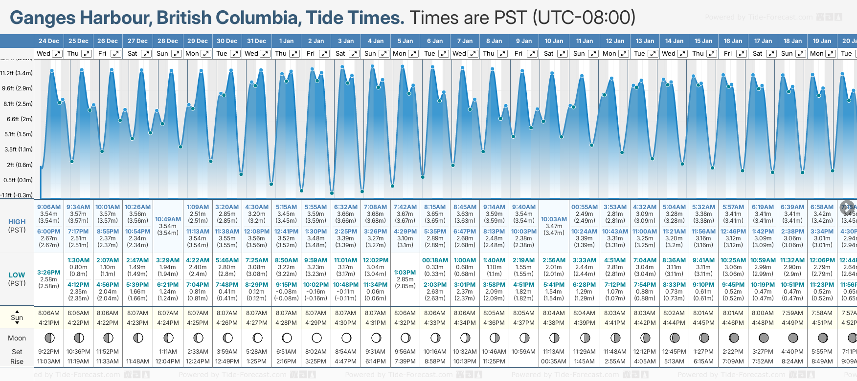 Tide Times are PST (UTC -8.0hrs). Last Spring High Tide at Ganges Harbour was on Sun 07 Dec (height: 3.65m 12.0ft). Next high Spring Tide at Ganges Harbour will be on Thu 25 Dec (height: 3.57m 11.7ft).