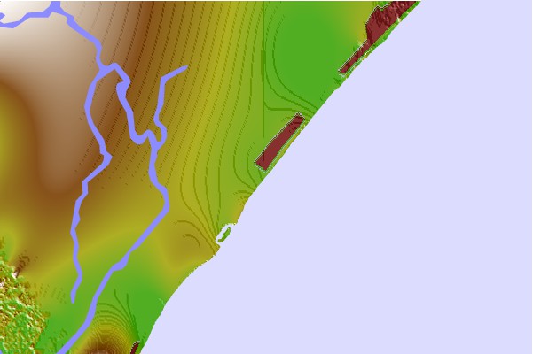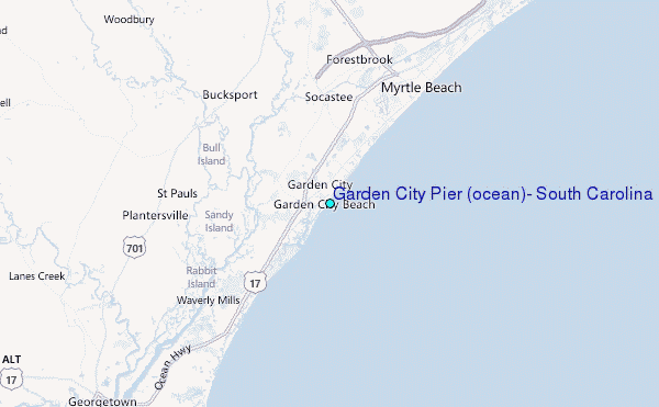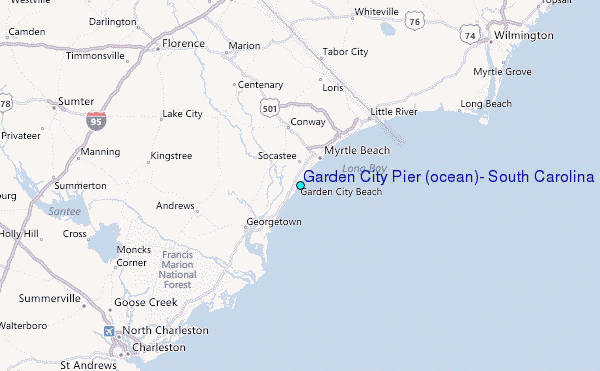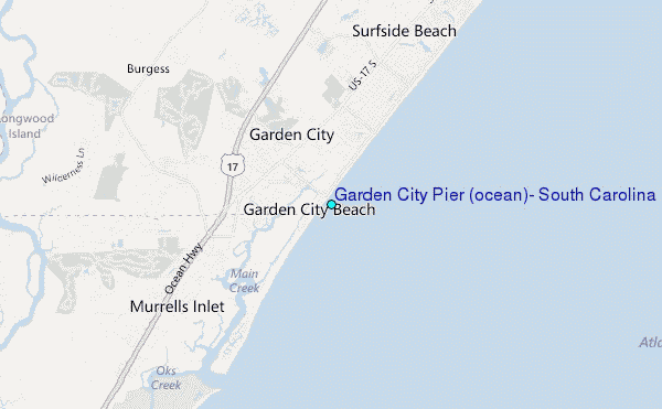 Use this relief map to navigate to tide stations, surf breaks and cities that are in the area of Garden City Pier (ocean), South Carolina.