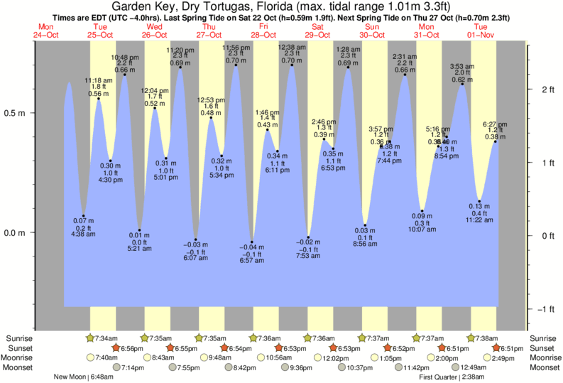 Tide Times are EST (UTC -5.0hrs). Last Spring High Tide at Garden Key, Dry Tortugas was on Fri 05 Dec (height: 0.68m 2.2ft). Next high Spring Tide at Garden Key, Dry Tortugas will be on Sun 21 Dec (height: 0.53m 1.7ft).