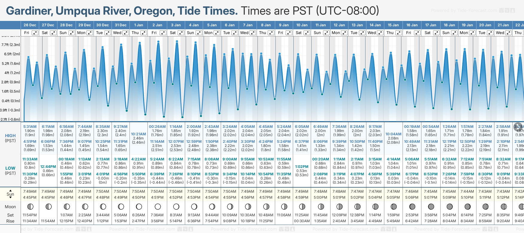 December and January Tide charts for Gardiner, Umpqua River: The tide charts below show the height, time and date of high and low tides for the next 30 days.