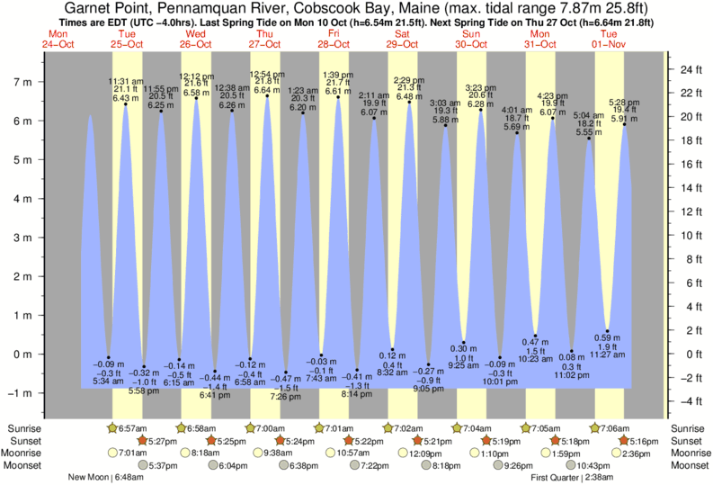 Tide Times are EST (UTC -5.0hrs). Last Spring High Tide at Garnet Point, Pennamquan River, Cobscook Bay was on Fri 05 Dec (height: 7.03m 23.1ft). Next high Spring Tide at Garnet Point, Pennamquan River, Cobscook Bay will be on Sun 21 Dec (height: 5.97m 19.6ft).