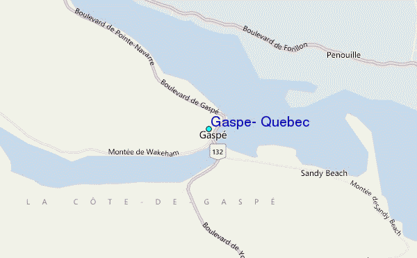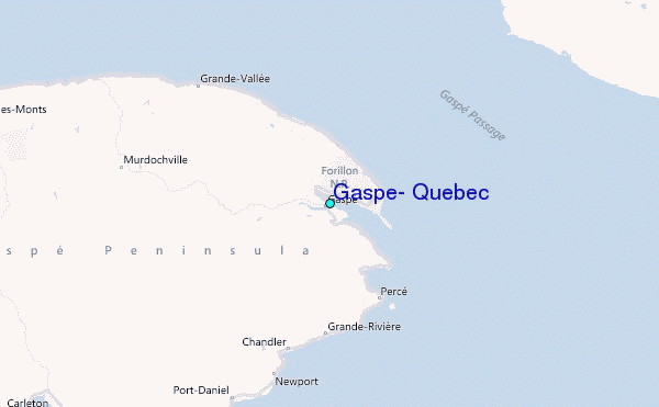Use this relief map to navigate to tide stations, surf breaks and cities that are in the area of Gaspe, Quebec.