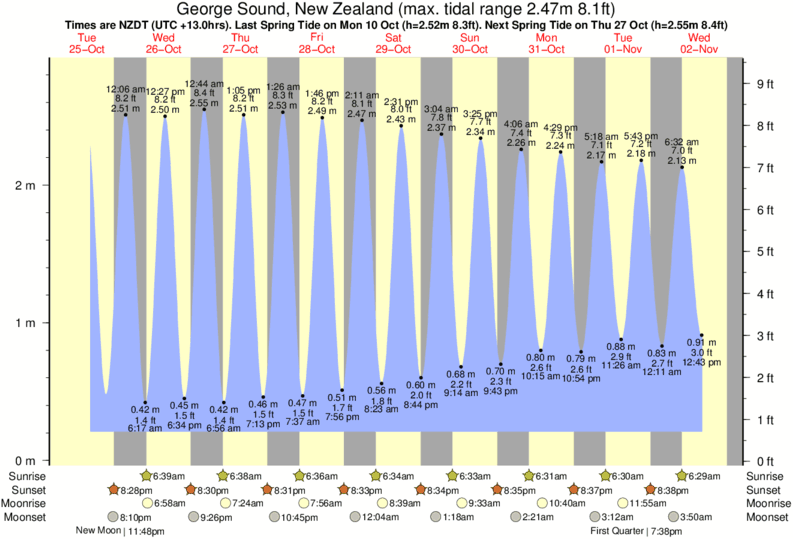 Tide Times are NZDT (UTC +13.0hrs). Last Spring High Tide at George Sound was on Sun 07 Dec (height: 2.59m 8.5ft). Next high Spring Tide at George Sound will be on Tue 23 Dec (height: 2.37m 7.8ft).