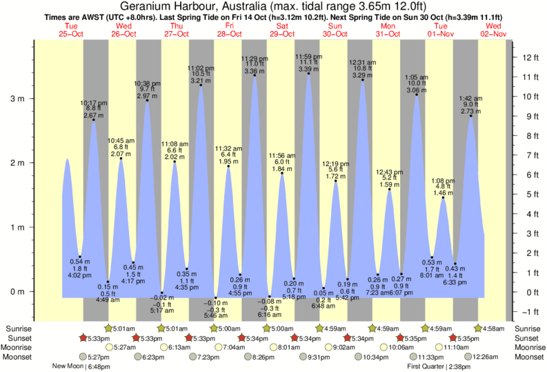 Tide Times are AWST (UTC +8.0hrs). Last Spring High Tide at Geranium Harbour was on Mon 08 Dec (height: 3.48m 11.4ft). Next high Spring Tide at Geranium Harbour will be on Tue 23 Dec (height: 2.98m 9.8ft).