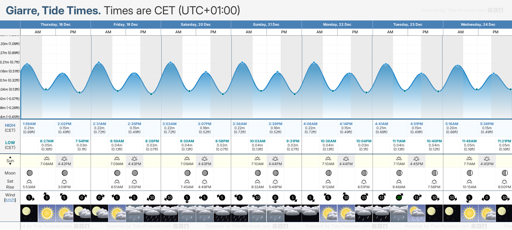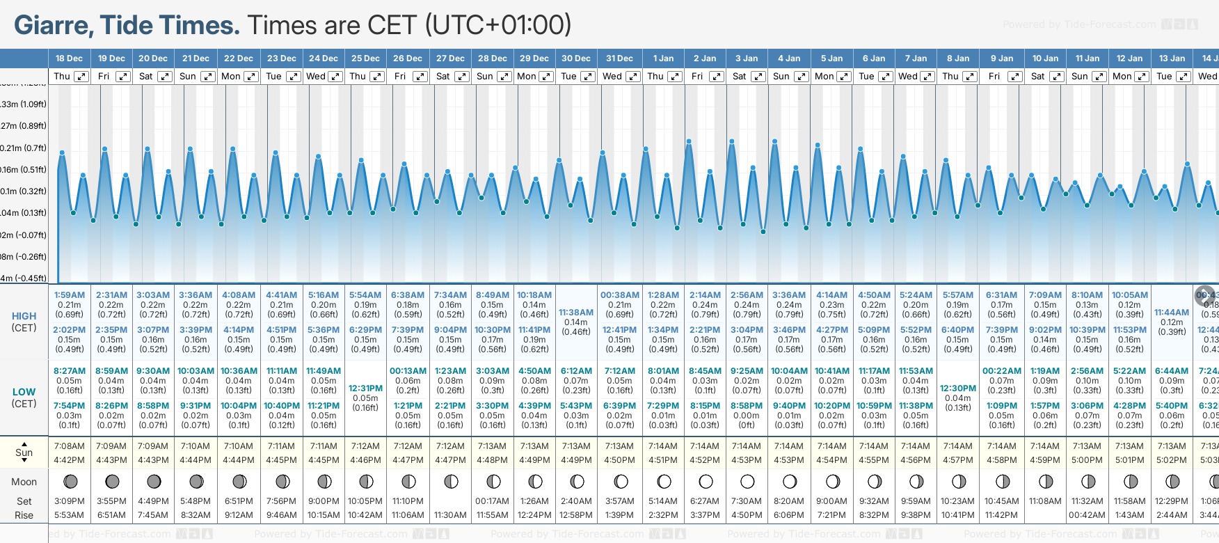 December and January Tide charts for Giarre: The tide charts below show the height, time and date of high and low tides for the next 30 days.