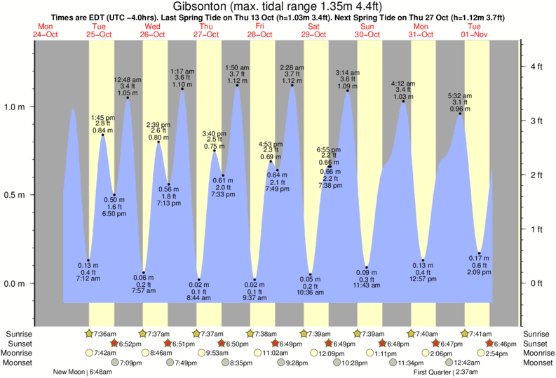 Gibsonton tide chart key: The tide chart above shows the height and times of high tide and low tide for Gibsonton. The grey shading corresponds to nighttime hours between sunset and sunrise at Gibsonton.