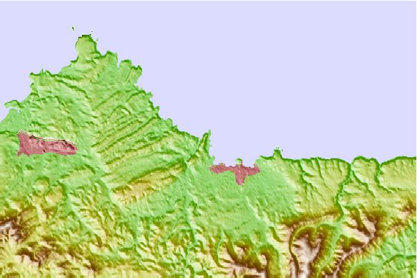 Use this relief map to navigate to tide stations, surf breaks and cities that are in the area of Gijon, Spain.