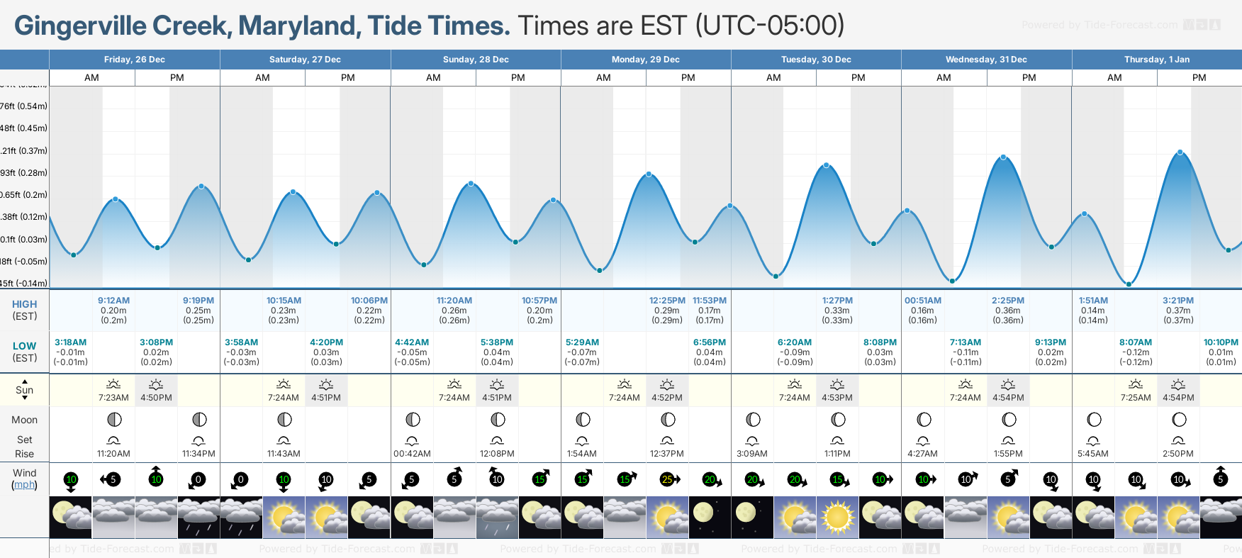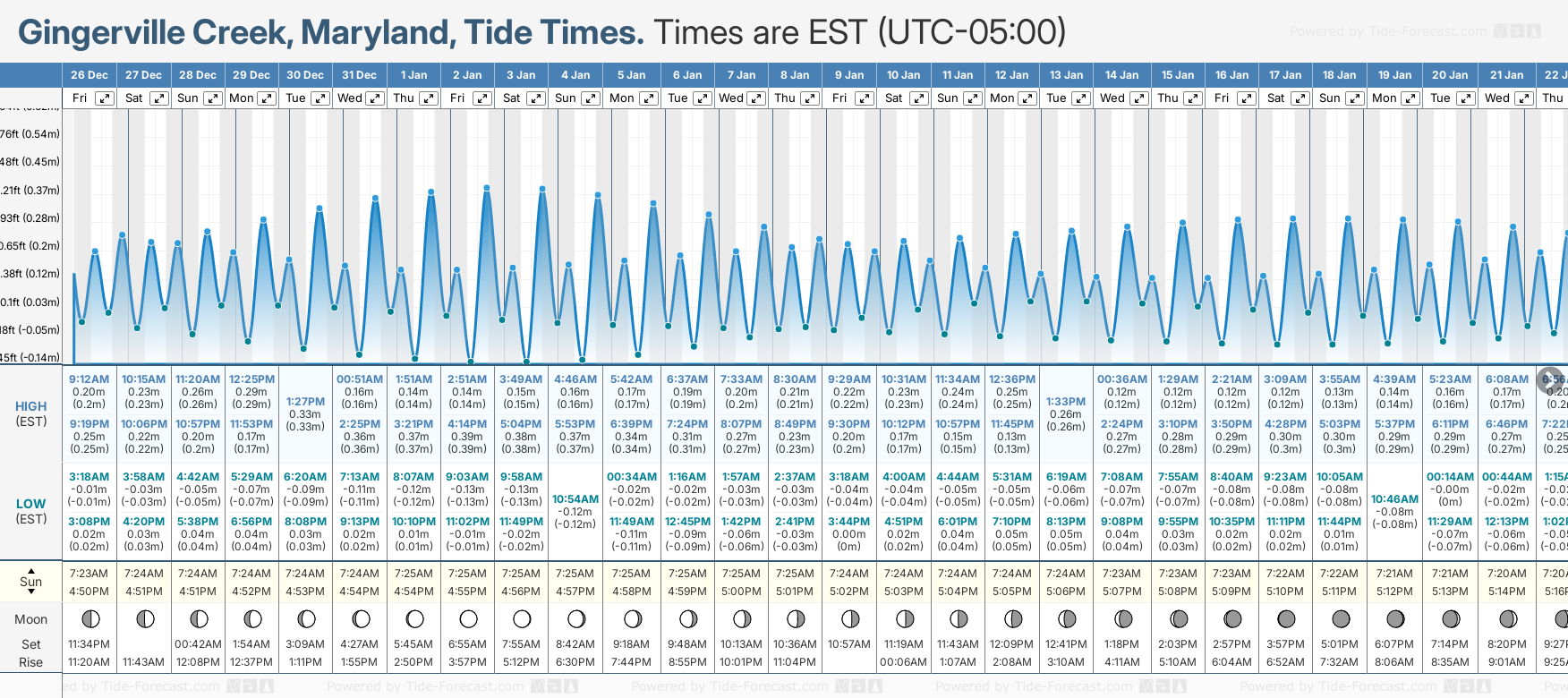 December and January Tide charts for Gingerville Creek: The tide charts below show the height, time and date of high and low tides for the next 30 days.