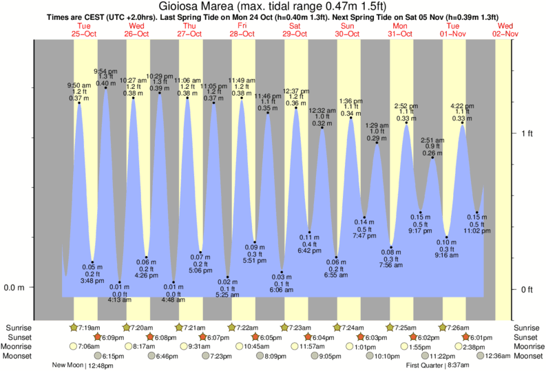 Tide Times are CET (UTC +1.0hrs). Last Spring High Tide at Gioiosa Marea was on Sun 07 Dec (height: 0.41m 1.3ft). Next high Spring Tide at Gioiosa Marea will be on Mon 22 Dec (height: 0.37m 1.2ft).