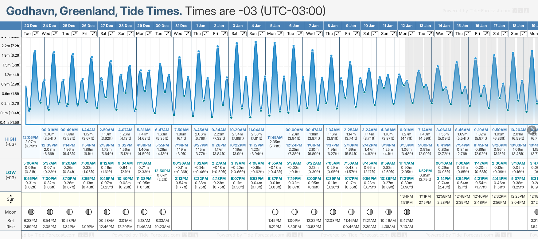 December and January Tide charts for Godhavn: The tide charts below show the height, time and date of high and low tides for the next 30 days.
