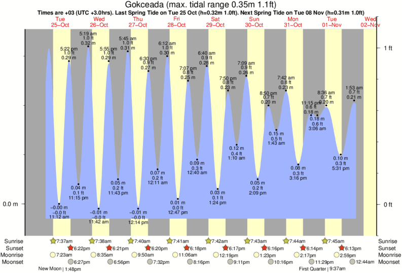 Tide Times are +03 (UTC +3.0hrs). Last Spring High Tide at Gokceada was on Sat 06 Dec (height: 0.30m 1.0ft). Next high Spring Tide at Gokceada will be on Sun 21 Dec (height: 0.29m 1.0ft).