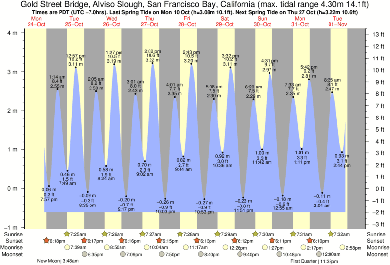 Tide chart for Gold Street Bridge, Alviso Slough, San Francisco BayShowing low and high tide times for the next 30 days at Gold Street Bridge, Alviso Slough, San Francisco Bay. Tide Times are PST (UTC -8.0hrs).
