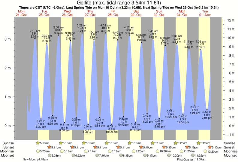 Tide Times are CST (UTC -6.0hrs). Last Spring High Tide at Golfito was on Fri 05 Dec (height: 3.30m 10.8ft). Next high Spring Tide at Golfito will be on Sun 21 Dec (height: 2.80m 9.2ft).