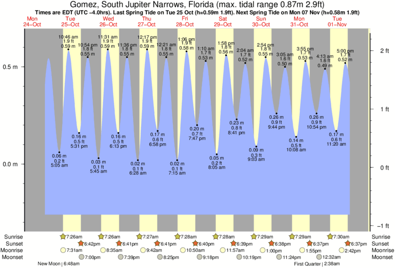 Tide Times are EST (UTC -5.0hrs). Last Spring High Tide at Gomez, South Jupiter Narrows was on Fri 05 Dec (height: 0.57m 1.9ft). Next high Spring Tide at Gomez, South Jupiter Narrows will be on Sat 20 Dec (height: 0.45m 1.5ft).
