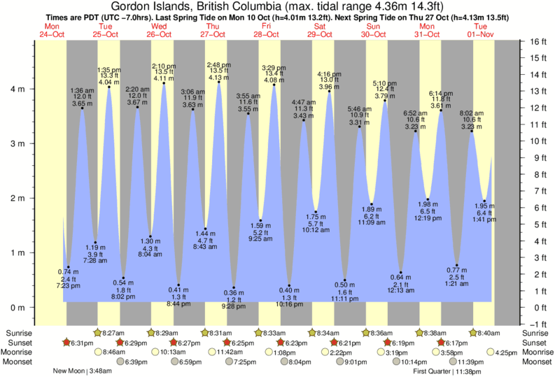 Tide Times are PST (UTC -8.0hrs). Last Spring High Tide at Gordon Islands was on Fri 05 Dec (height: 4.42m 14.5ft). Next high Spring Tide at Gordon Islands will be on Sat 03 Jan (height: 4.38m 14.4ft).