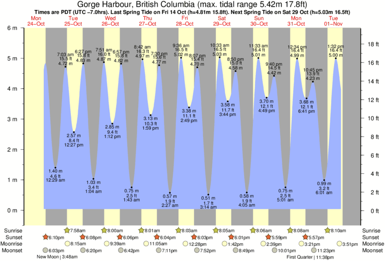 Gorge Harbour tide chart key: The tide chart above shows the height and times of high tide and low tide for Gorge Harbour, British Columbia. The grey shading corresponds to nighttime hours between sunset and sunrise at Gorge Harbour.