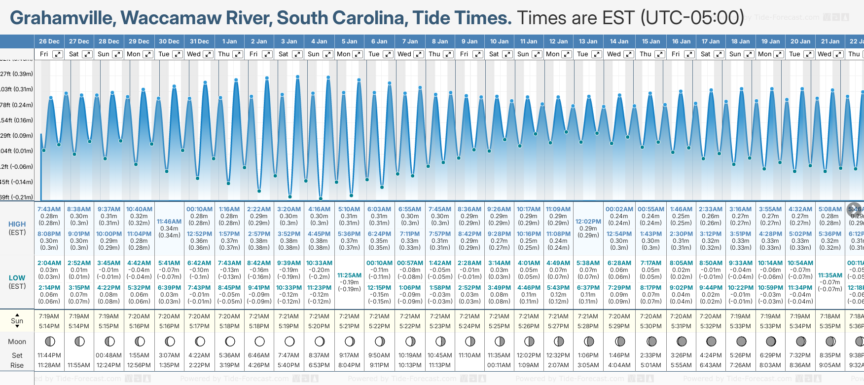 December and January Tide charts for Grahamville, Waccamaw River: The tide charts below show the height, time and date of high and low tides for the next 30 days.
