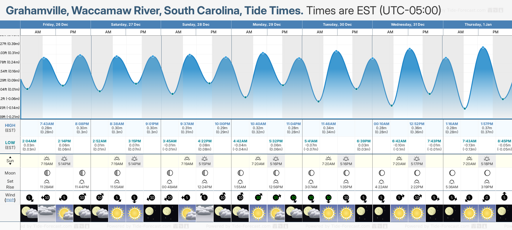Tide chart for Grahamville, Waccamaw RiverShowing low and high tide times for the next 30 days at Grahamville, Waccamaw River. Tide Times are EST (UTC -5.0hrs).