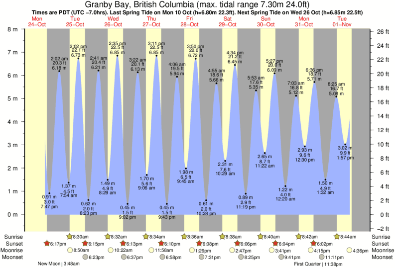 Tide Times are PST (UTC -8.0hrs). Last Spring High Tide at Granby Bay was on Fri 05 Dec (height: 7.28m 23.9ft). Next high Spring Tide at Granby Bay will be on Sat 03 Jan (height: 7.15m 23.5ft).