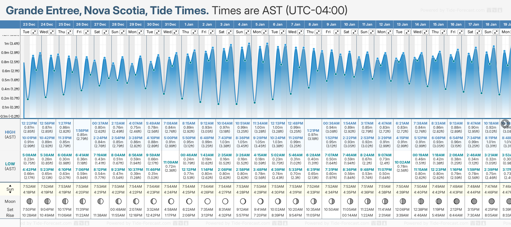 Tide Times are AST (UTC -4.0hrs). Last Spring High Tide at Grande Entree was on Mon 22 Dec (height: 0.92m 3.0ft). Next high Spring Tide at Grande Entree will be on Sun 04 Jan (height: 1.05m 3.4ft).
