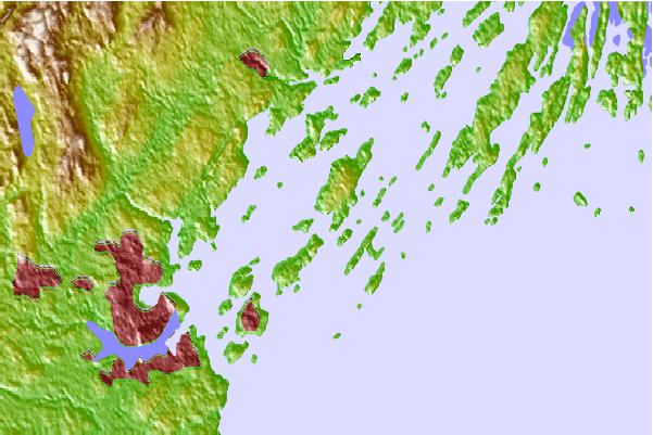 Use this relief map to navigate to tide stations, surf breaks and cities that are in the area of Great Chebeague Island, Maine.