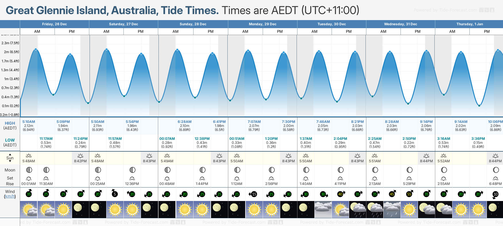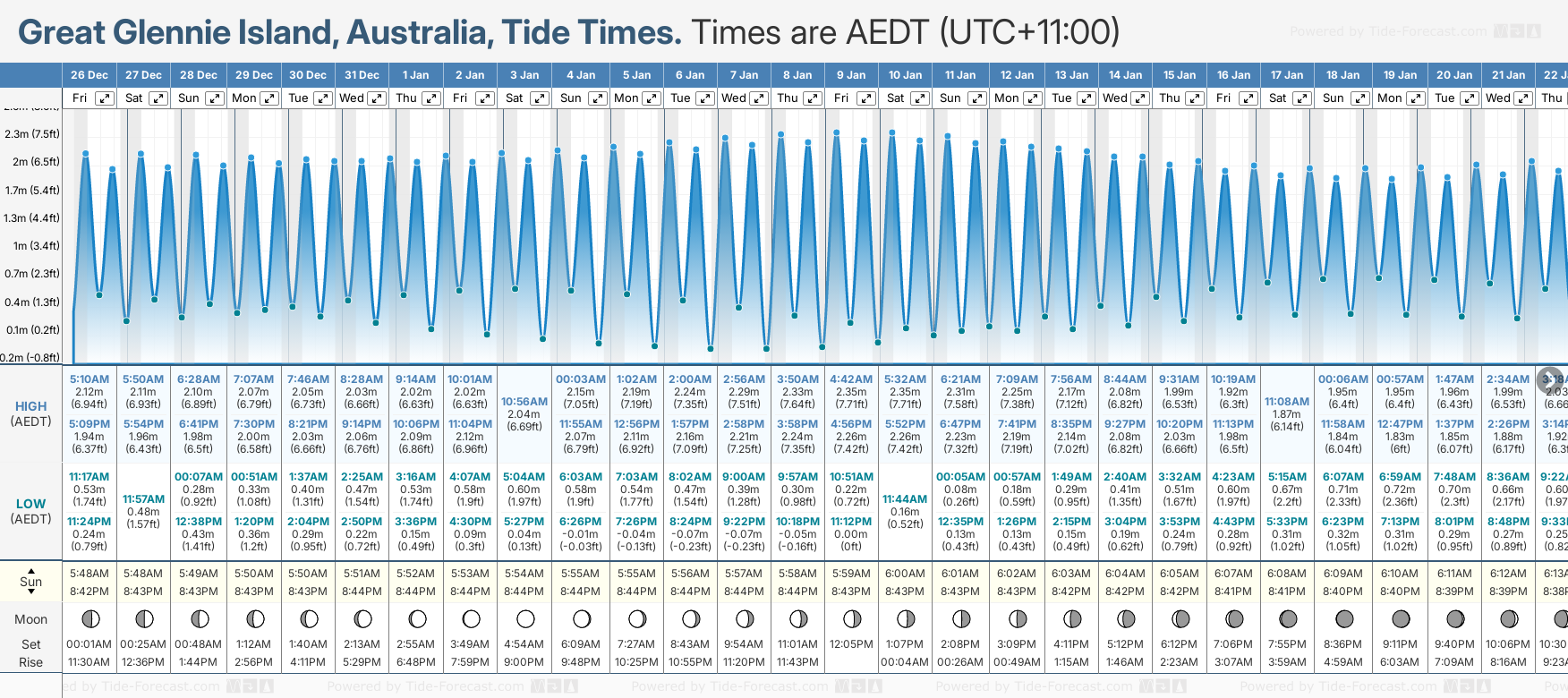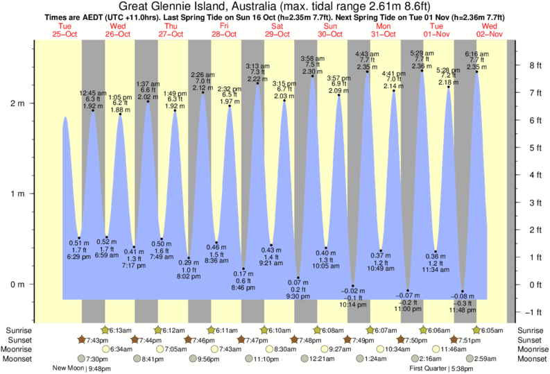 Tide Times are AEDT (UTC +11.0hrs). Last Spring High Tide at Great Glennie Island was on Thu 11 Dec (height: 2.42m 7.9ft). Next high Spring Tide at Great Glennie Island will be on Fri 26 Dec (height: 2.12m 7.0ft).