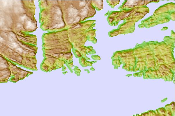 Use this relief map to navigate to tide stations, surf breaks and cities that are in the area of Great Jervis Harbour, Bay d'Espoir, Newfoundland.