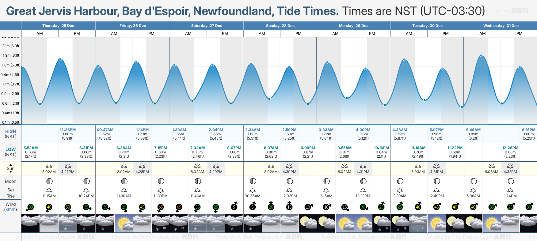 December and January Tide charts for Great Jervis Harbour, Bay d'Espoir: The tide charts below show the height, time and date of high and low tides for the next 30 days.