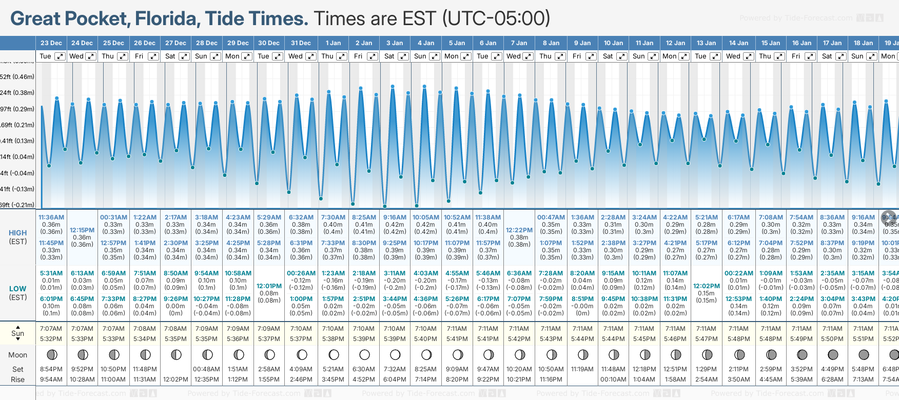 Tide Times are EST (UTC -5.0hrs). Last Spring High Tide at Great Pocket was on Sun 21 Dec (height: 0.37m 1.2ft). Next high Spring Tide at Great Pocket will be on Sat 03 Jan (height: 0.42m 1.4ft).