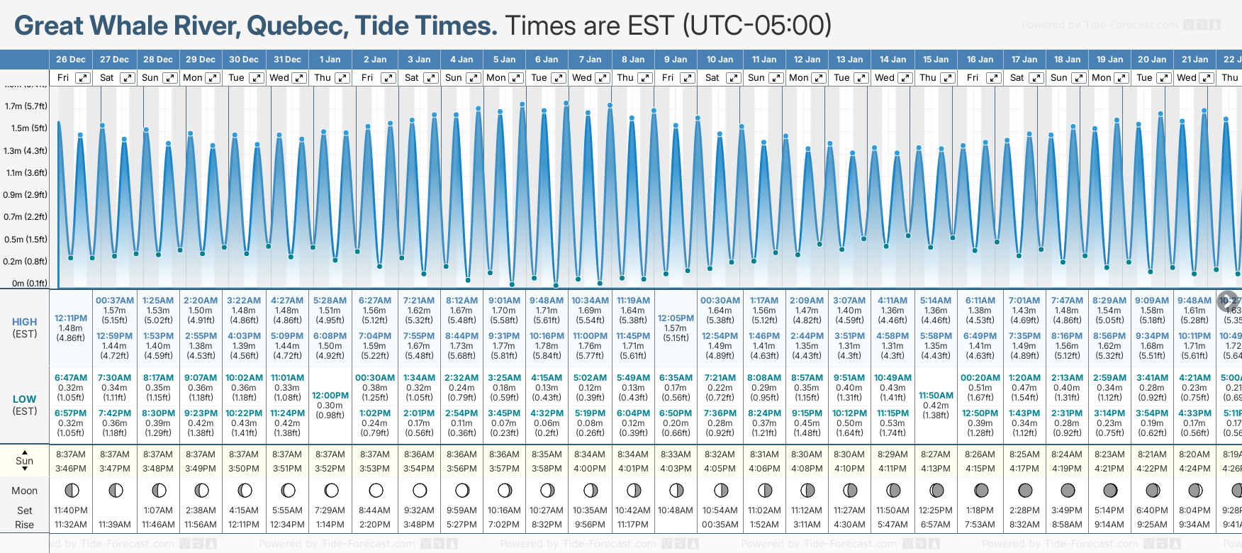 December and January Tide charts for Great Whale River: The tide charts below show the height, time and date of high and low tides for the next 30 days.