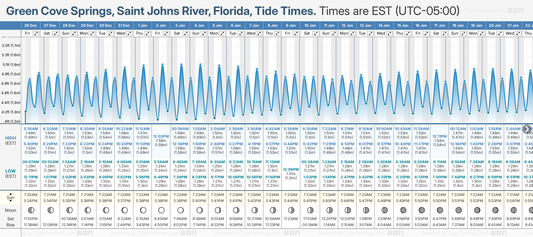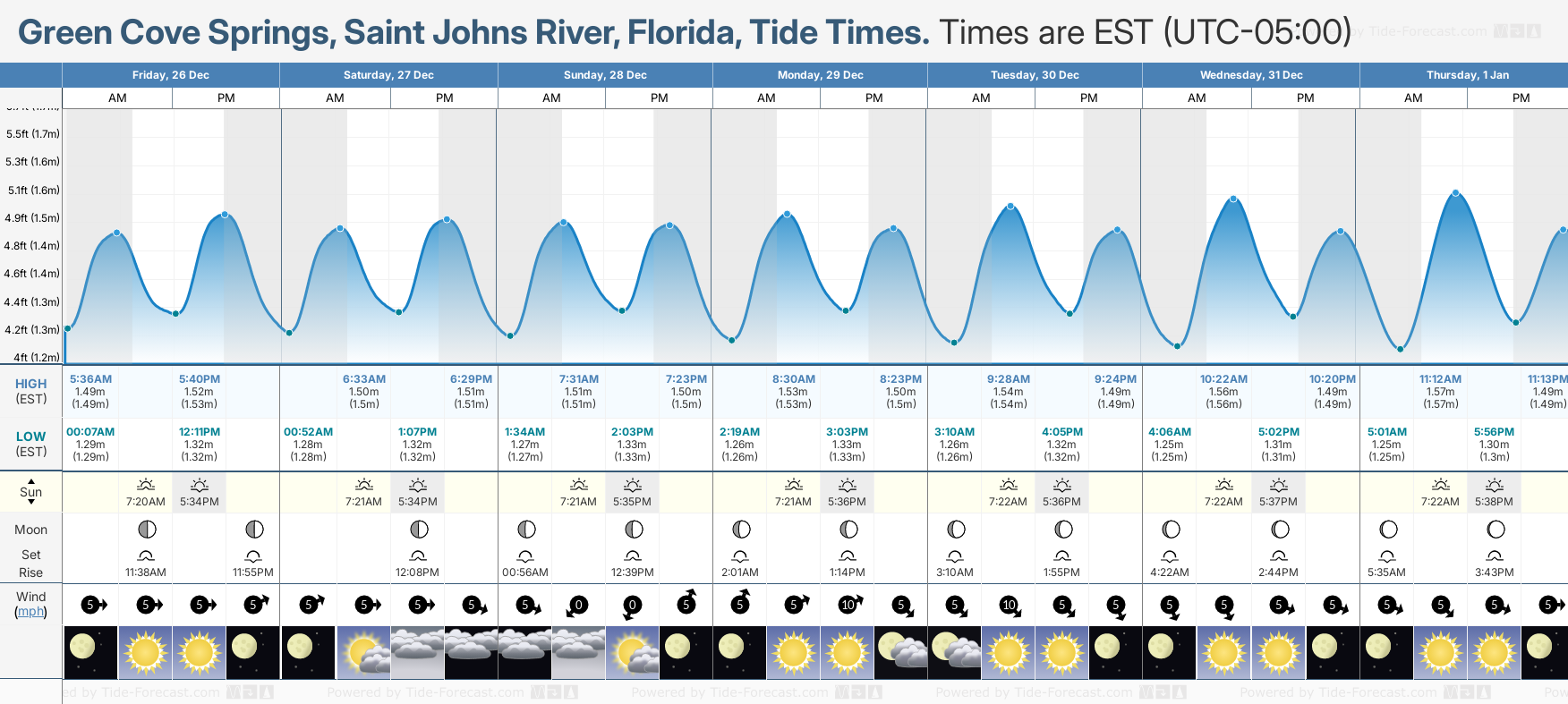 Tide chart for Green Cove SpringsShowing low and high tide times for the next 30 days at Green Cove Springs. Tide Times are EST (UTC -5.0hrs).