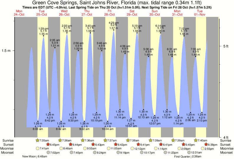 Tide Times are EST (UTC -5.0hrs). Last Spring High Tide at Green Cove Springs, Saint Johns River was on Sun 07 Dec (height: 1.58m 5.2ft). Next high Spring Tide at Green Cove Springs, Saint Johns River will be on Sat 20 Dec (height: 1.55m 5.1ft).