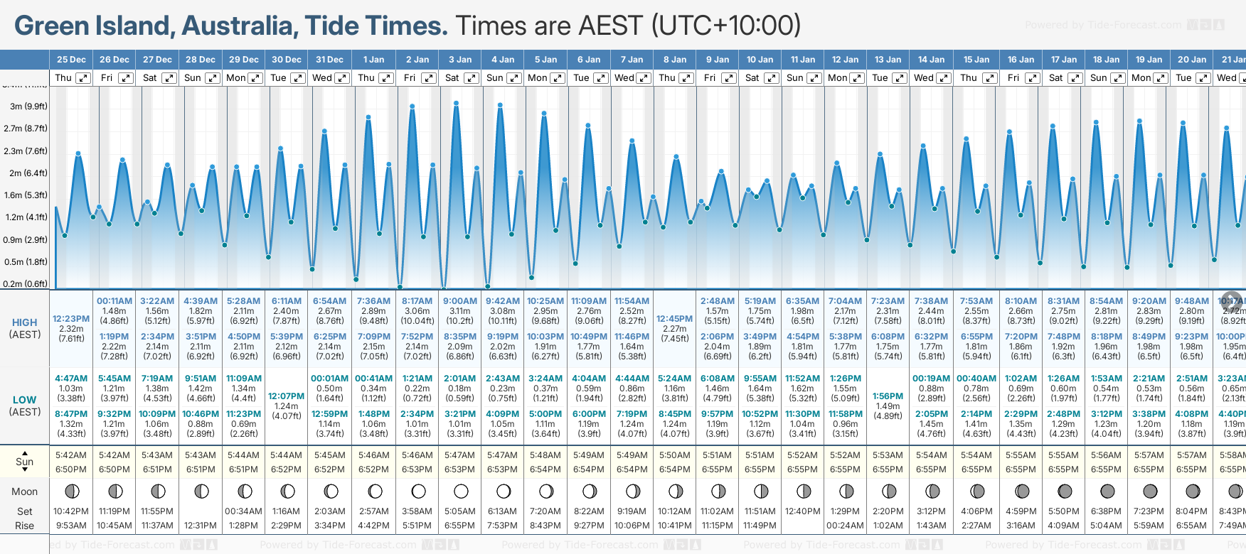 Tide Times are AEST (UTC +10.0hrs). Last Spring High Tide at Green Island was on Sun 21 Dec (height: 2.61m 8.6ft). Next high Spring Tide at Green Island will be on Sat 03 Jan (height: 3.11m 10.2ft).