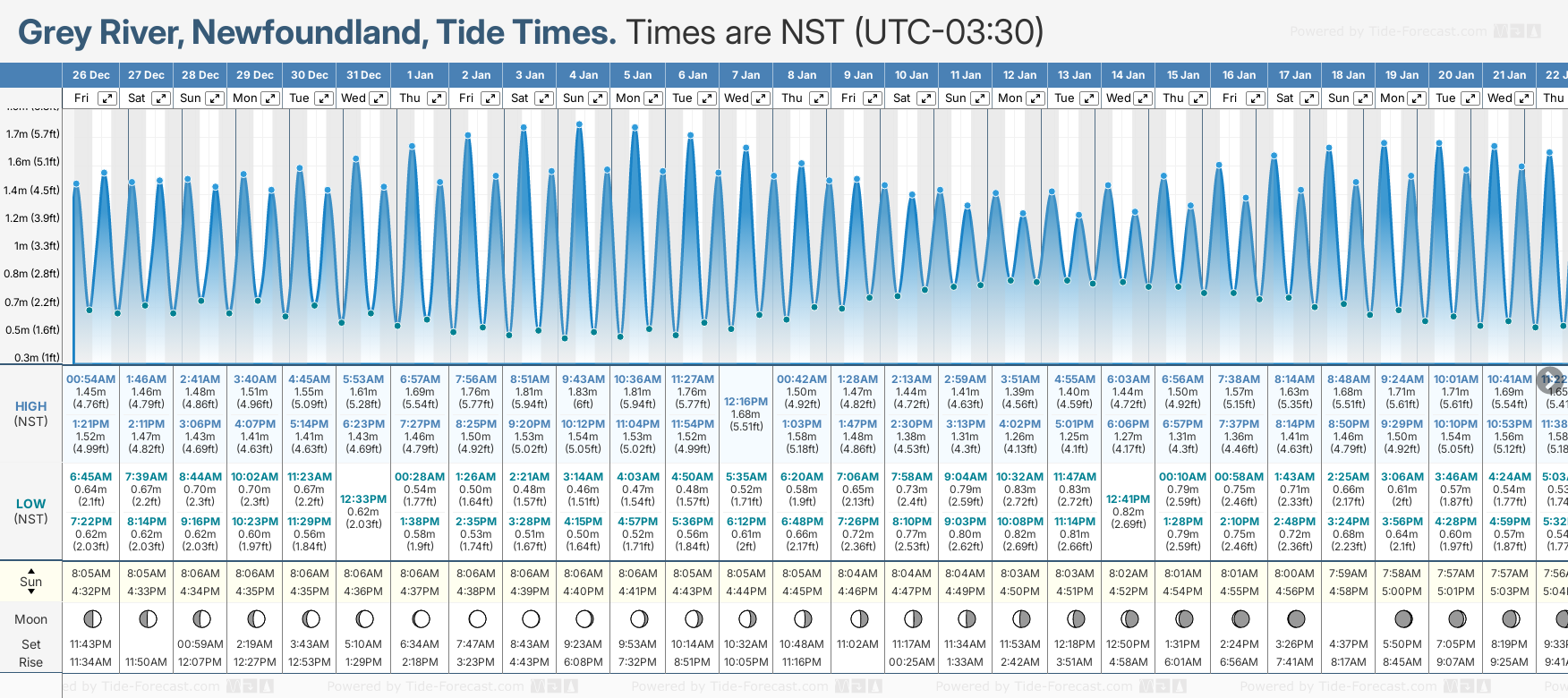 December and January Tide charts for Grey River: The tide charts below show the height, time and date of high and low tides for the next 30 days.
