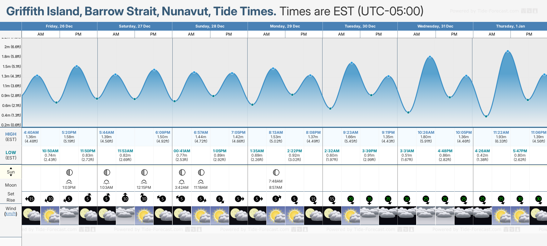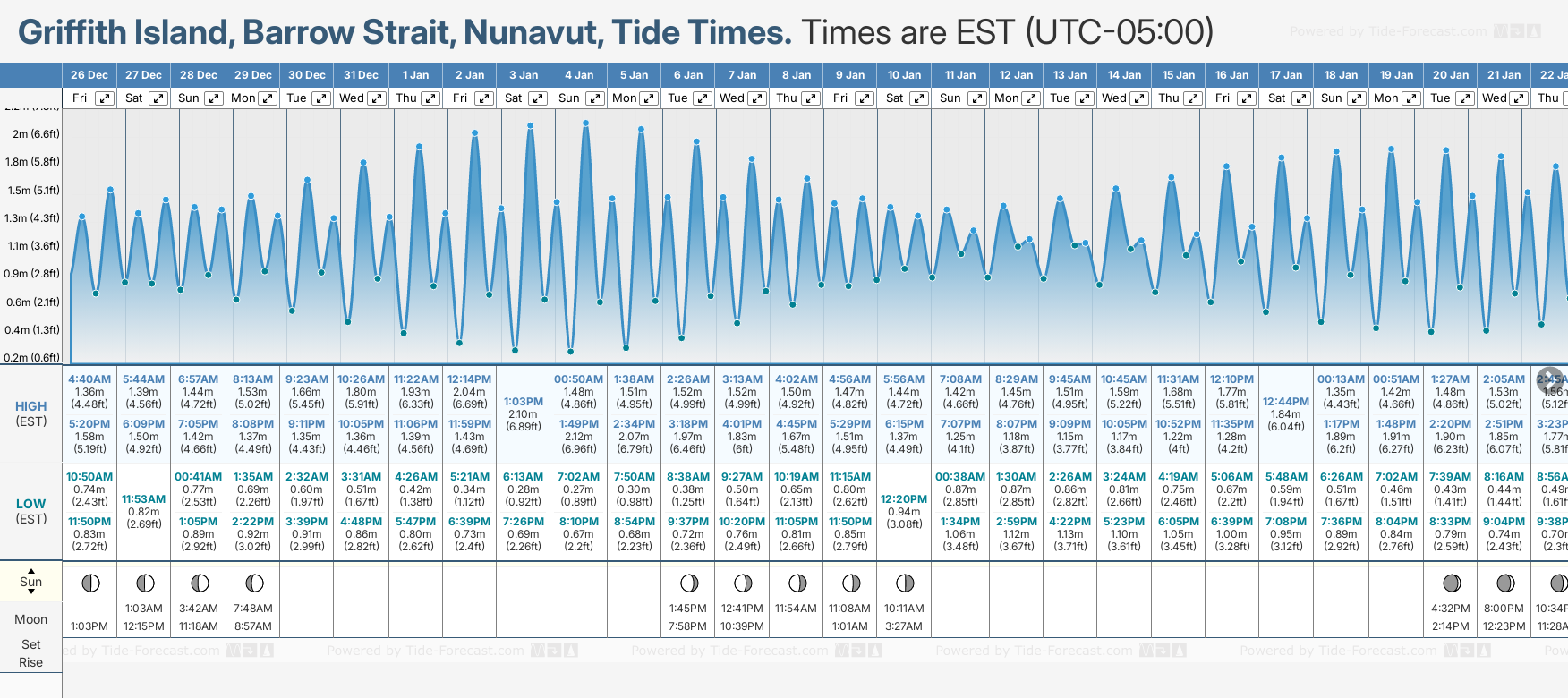 December and January Tide charts for Griffith Island, Barrow Strait: The tide charts below show the height, time and date of high and low tides for the next 30 days.