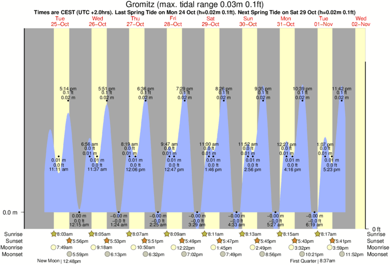 Tide Times are CET (UTC +1.0hrs). Last Spring High Tide at Gromitz was on Thu 18 Dec (height: 0.03m 0.1ft). Next high Spring Tide at Gromitz will be on Tue 23 Dec (height: 0.03m 0.1ft).