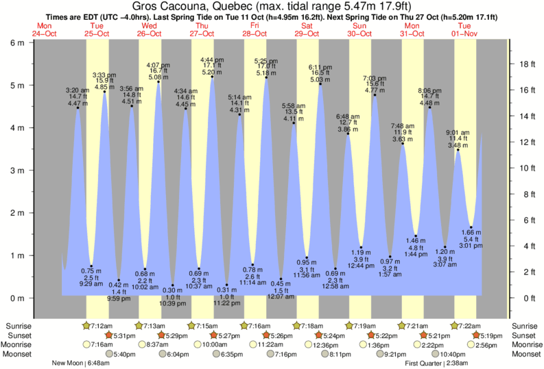 Tide Times are EST (UTC -5.0hrs). Last Spring High Tide at Gros Cacouna was on Sat 06 Dec (height: 5.46m 17.9ft). Next high Spring Tide at Gros Cacouna will be on Sun 21 Dec (height: 4.63m 15.2ft).