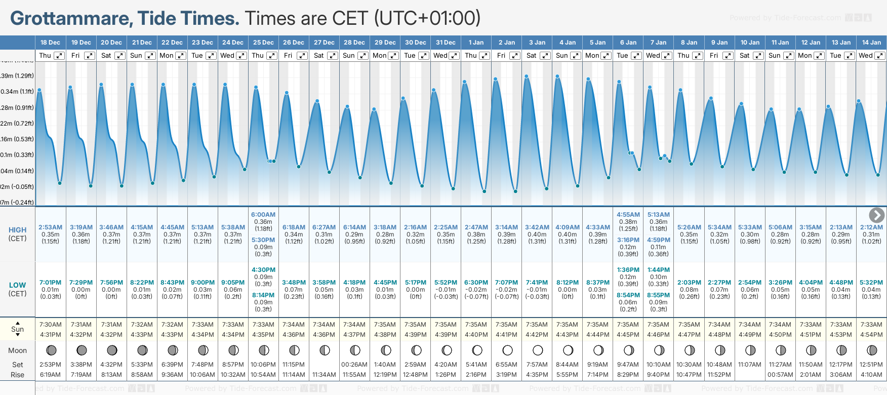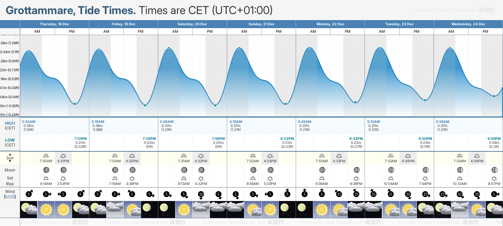 December and January Tide charts for Grottammare: The tide charts below show the height, time and date of high and low tides for the next 30 days.