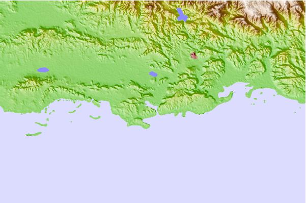 Use this relief map to navigate to tide stations, surf breaks and cities that are in the area of Guánica, Puerto Rico.