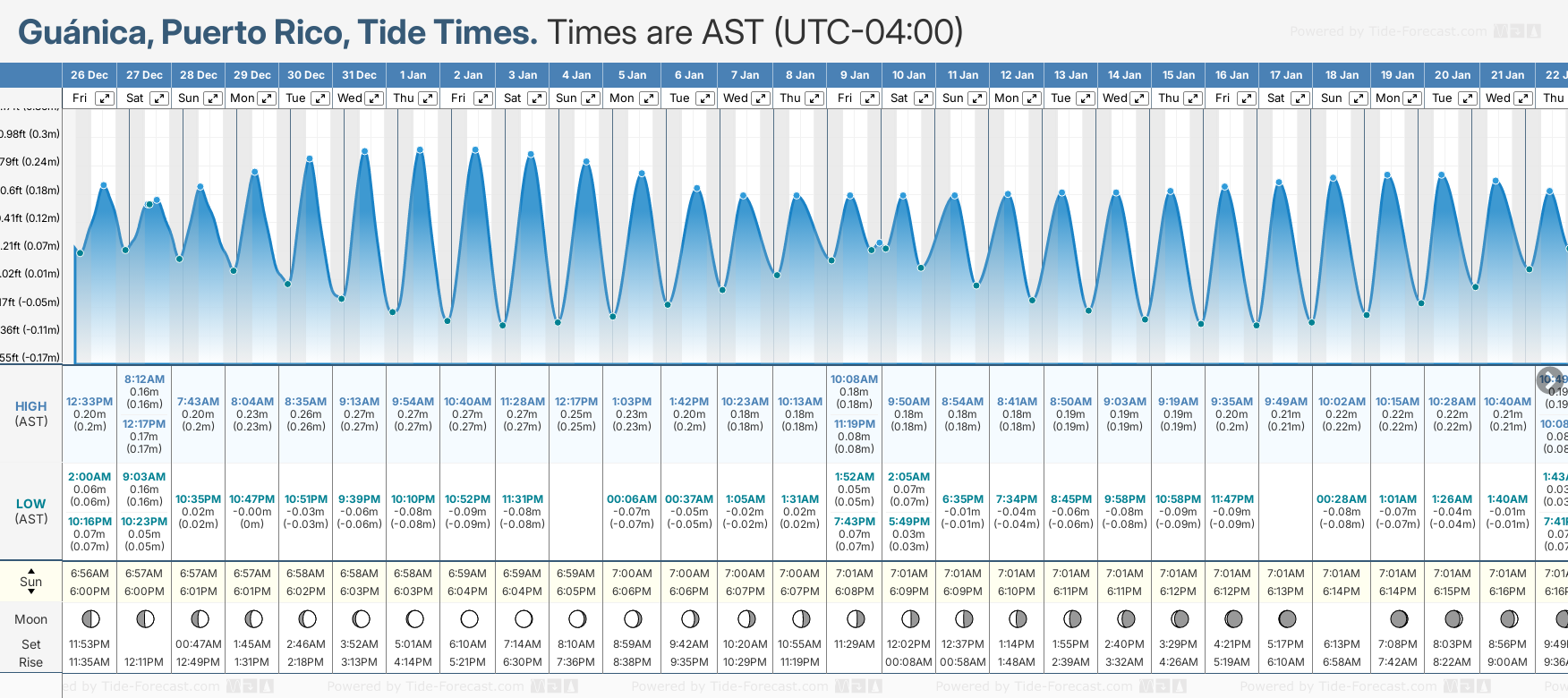 Tide Times are AST (UTC -4.0hrs). Last Spring High Tide at Guanica was on Tue 23 Dec (height: 0.25m 0.8ft). Next high Spring Tide at Guanica will be on Thu 01 Jan (height: 0.27m 0.9ft).