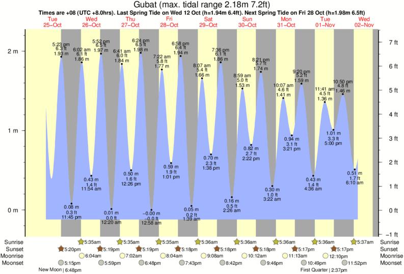 Tide Times are PST (UTC +8.0hrs). Last Spring High Tide at Gubat was on Sat 06 Dec (height: 2.04m 6.7ft). Next high Spring Tide at Gubat will be on Mon 22 Dec (height: 1.81m 5.9ft).