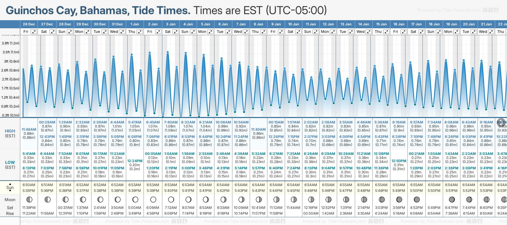 Tide Times are EST (UTC -5.0hrs). Last Spring High Tide at Guinchos Cay was on Sun 21 Dec (height: 0.98m 3.2ft). Next high Spring Tide at Guinchos Cay will be on Sat 03 Jan (height: 1.08m 3.5ft).