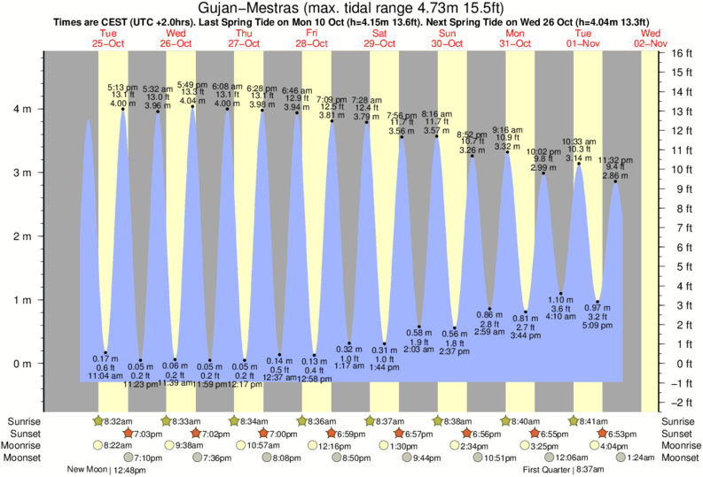 Tide Times are CET (UTC +1.0hrs). Last Spring High Tide at Gujan-Mestras was on Sat 06 Dec (height: 4.10m 13.5ft). Next high Spring Tide at Gujan-Mestras will be on Mon 22 Dec (height: 3.58m 11.7ft).