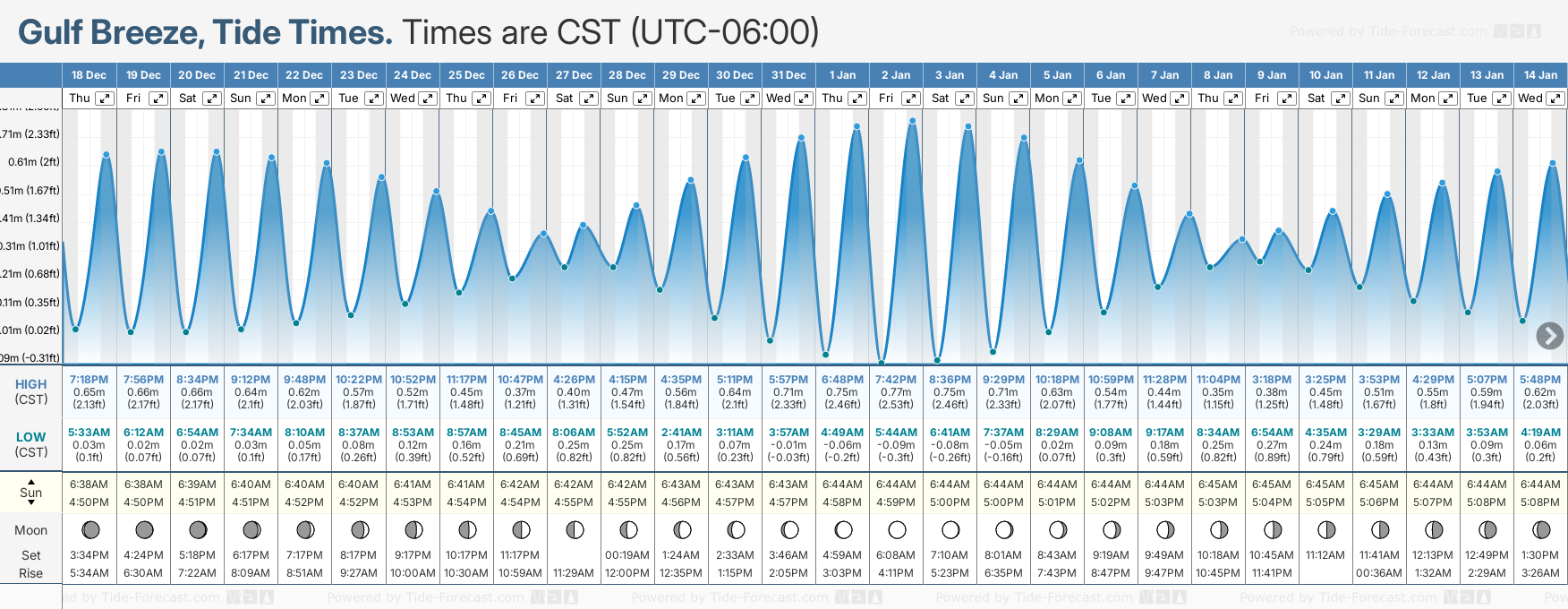 December and January Tide charts for Gulf Breeze: The tide charts below show the height, time and date of high and low tides for the next 30 days.