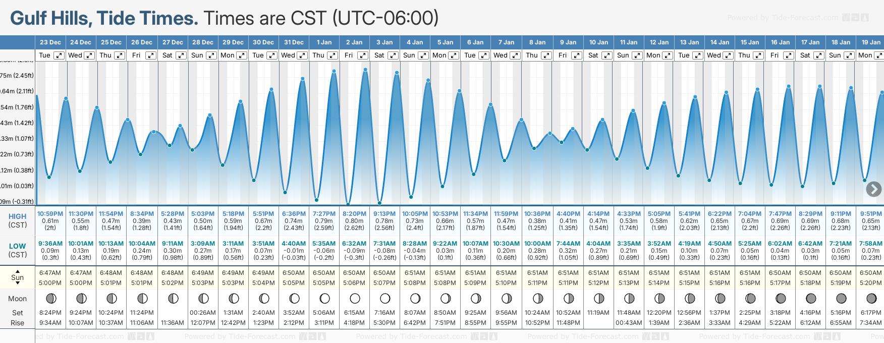 Tide chart for Gulf HillsShowing low and high tide times for the next 30 days at Gulf Hills. Tide Times are CST (UTC -6.0hrs).